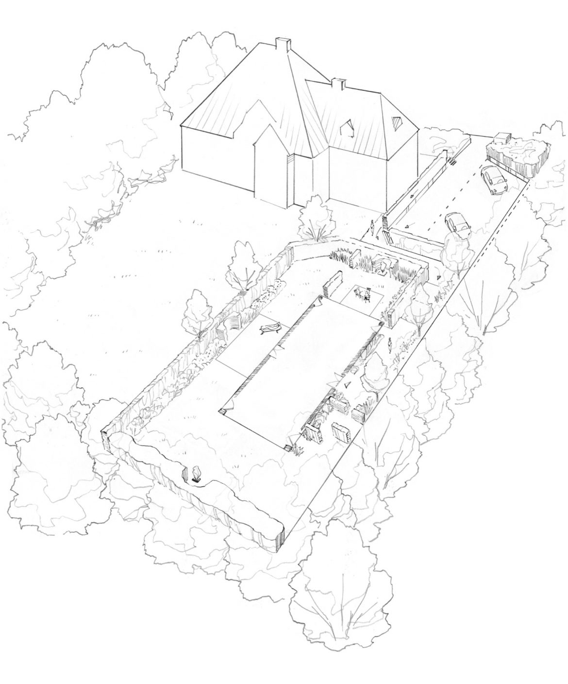 Conception et réalisation d’un jardin résidentiel à Uccle. Le projet articule des espaces de vie extérieurs structurés autour d’une végétation choisie pour ses qualités esthétiques et ses vertus écologiques, en harmonie avec l’architecture de la demeure.